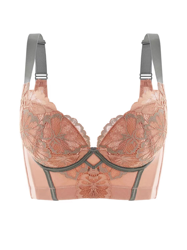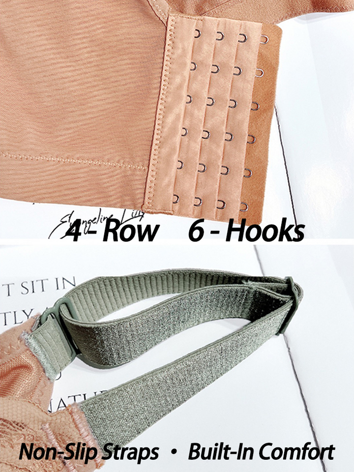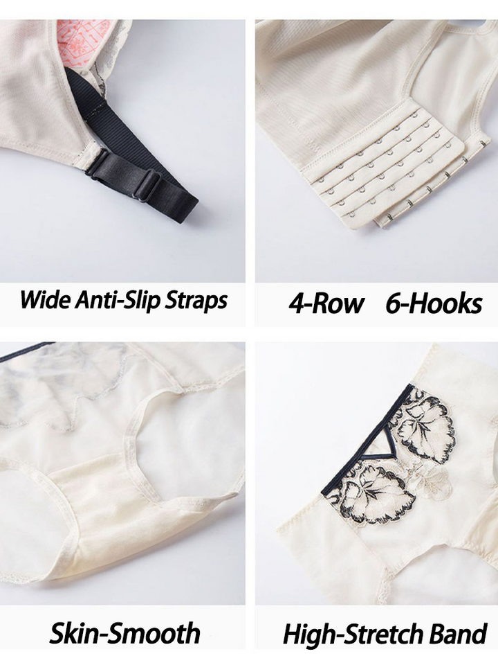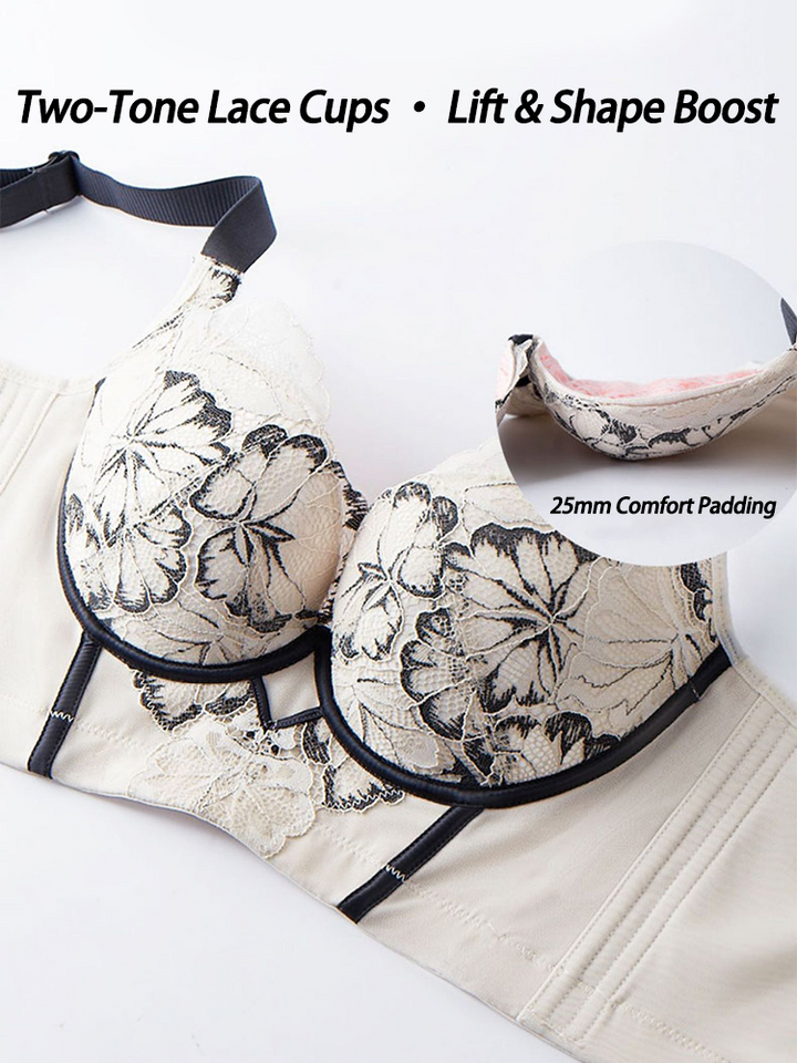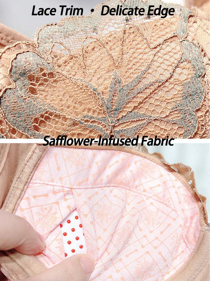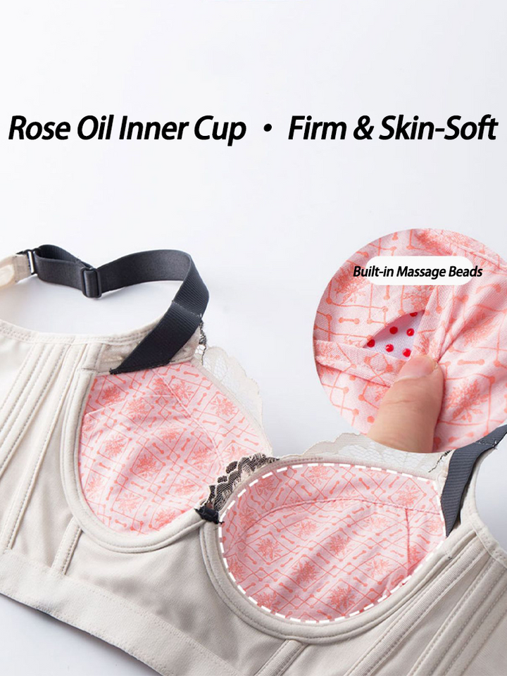 Dual-tone lace overlay enhances natural curves while rose-oil infused inner cups with massage beads gently nourish skin. Experience 3D sculpted cups that lift without gaping, supported by shape-memory NiTi alloy wires for stable uplift & zero pressure.