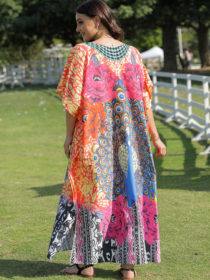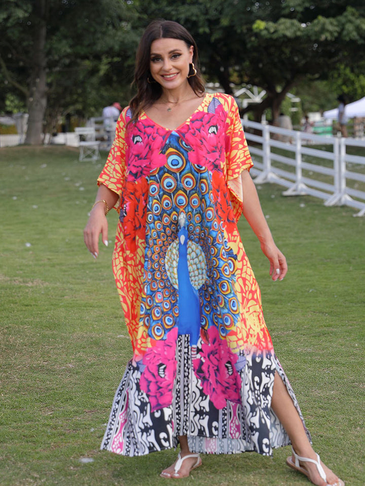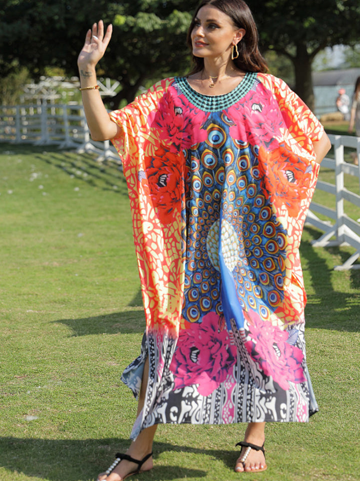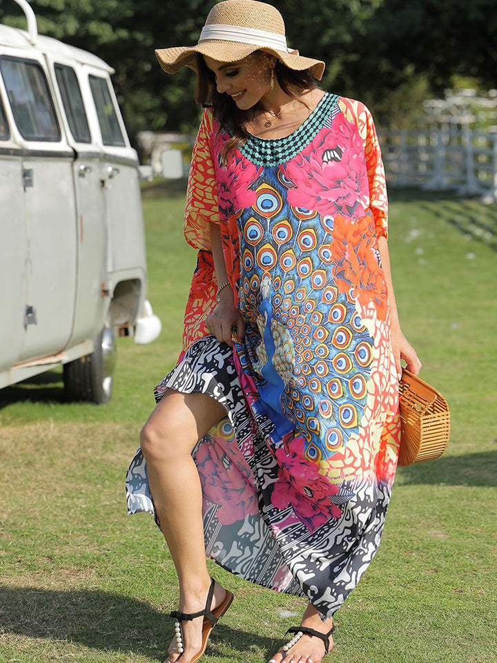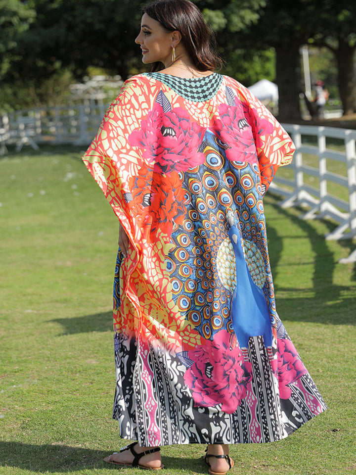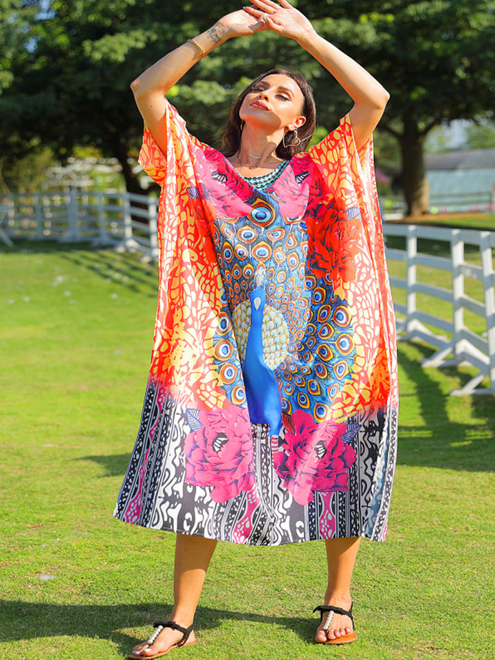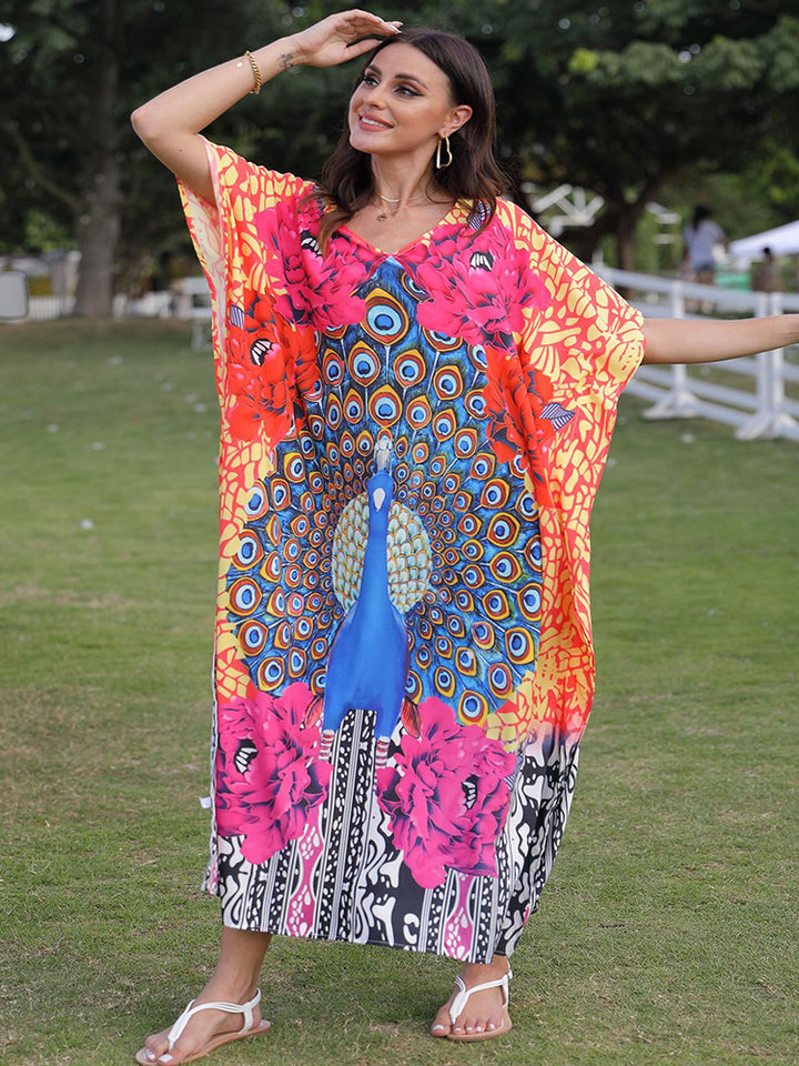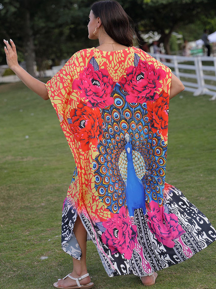 Embrace the sun in elegance with our Peacock Kimono Beach Cover-Up ! Crafted for the style-savvy traveler, this lightweight robe dress combines UPF 50+ sun protection with breathtaking peacock prints, transforming your beach days into a runway of tropical glamour.
