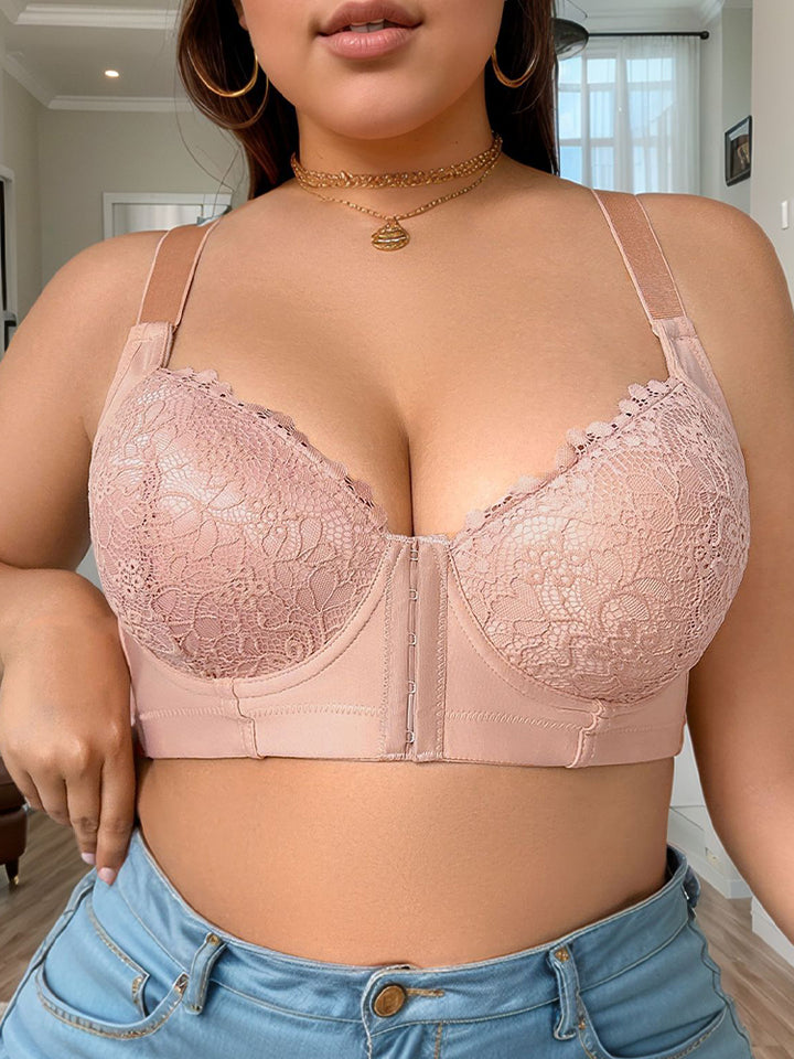 Plus-Size Embroidered Lace Front-Closure Underwire Bra – U-Back Lift