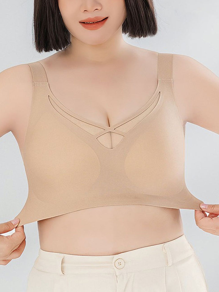 Enjoy breathable comfort and smooth shaping with our Plus-Size Mesh-Panel Seamless Wireless Bra, designed to flatter fuller figures with effortless ease. The seamless construction ensures a sleek, invisible fit under any outfit, while the wireless design provides gentle, pressure-free support for all-day comfort. Featuring delicate mesh panels, it enhances ventilation and adds a touch of modern elegance. The minimizing effect helps create a balanced, refined silhouette, while light shaping contours the bust for a naturally lifted look. Crafted from soft, stretchy fabric, it moves with your body and keeps you cool throughout the day. Wide adjustable straps and a supportive underband provide a secure, customized fit. Perfect for daily wear, this bra combines breathable design, light shaping, and seamless comfort for an effortlessly smooth finish.
