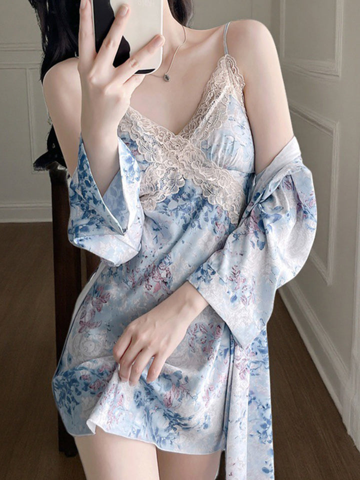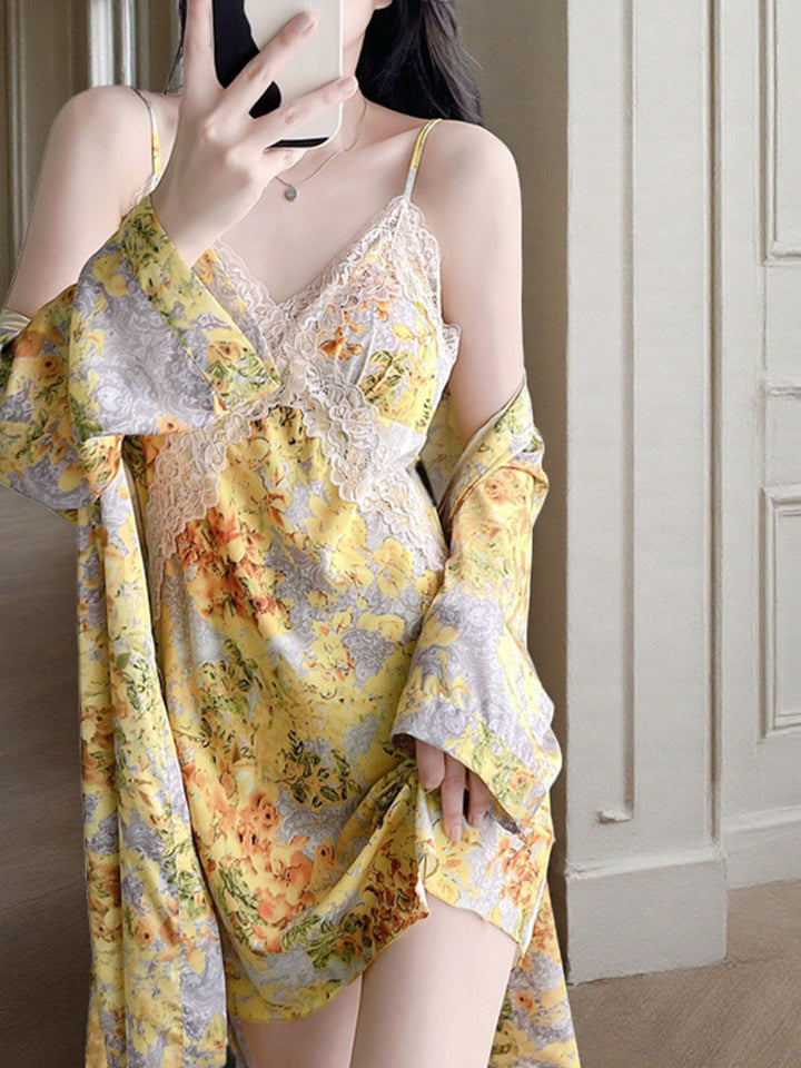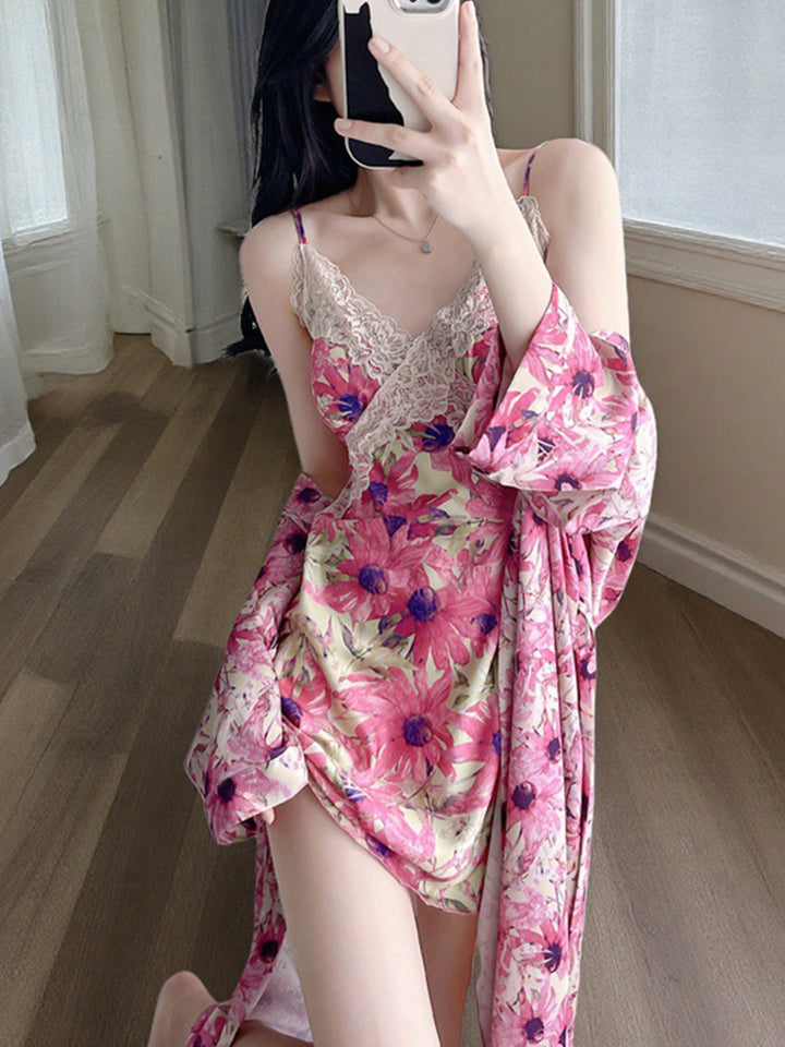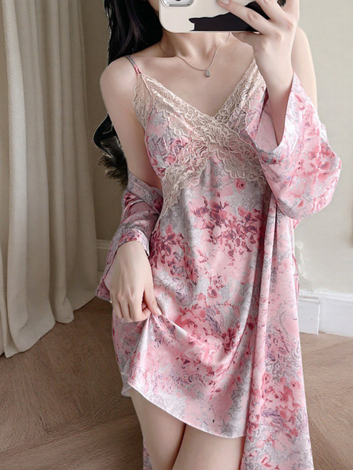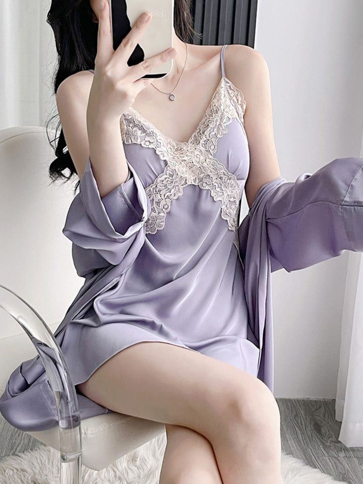 Sheer Satin Chemise Nightdress & Robe Two-Piece Set - Sensual Sleepwear