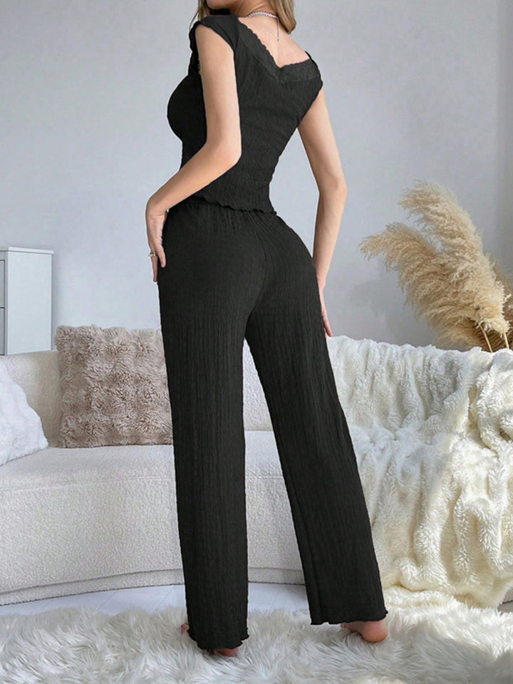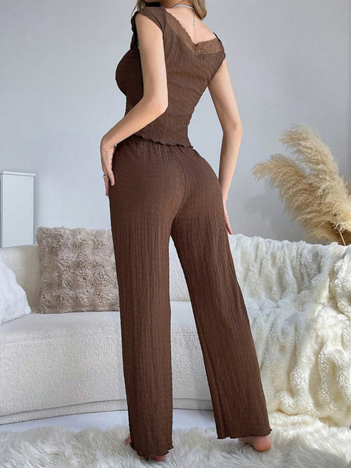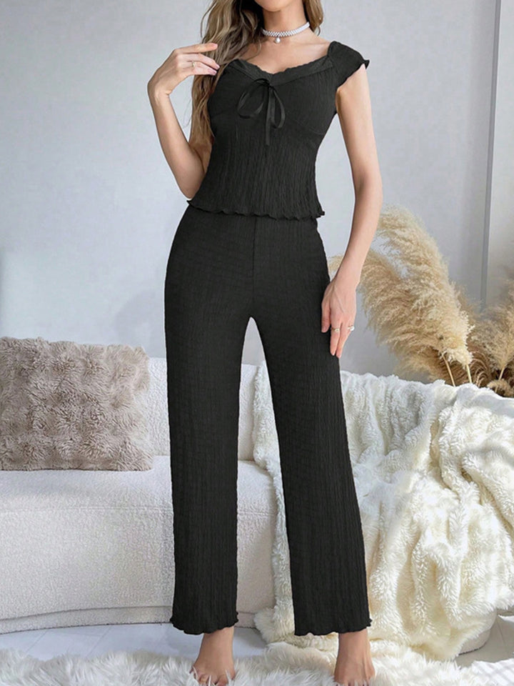 V-Neck Lace Sleepwear Set for Women - Elegant Bow Detail Slim-Fit Pajamas